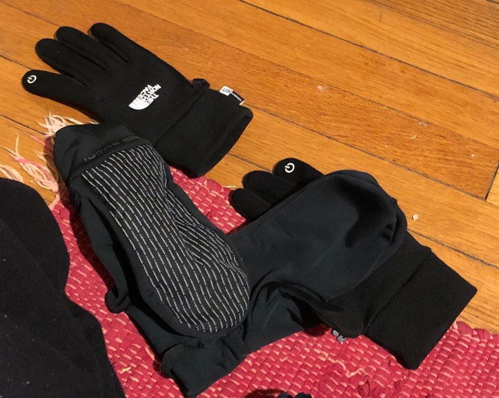 I have a pair of gloves and a pair of mittens that I bought specifically for running. I hardly ever wear them as I find that the parts of myself that I want uncovered first, as I warm up, are my hands and then wrists. So what I normally do is pull the bottoms of my shirts over my hands to start out and the, when I’m warmed up, n push them back and often turn them back off my wrists. But there are days, when it’s windy or rainy or just a very raw cold when I want one or both pairs. Both are able to work the phone, although the gloves work better in that way than the mittens. I got the mittens mainly for wind and rain. They’re not entirely water and windproof, but they do the job when I need them.