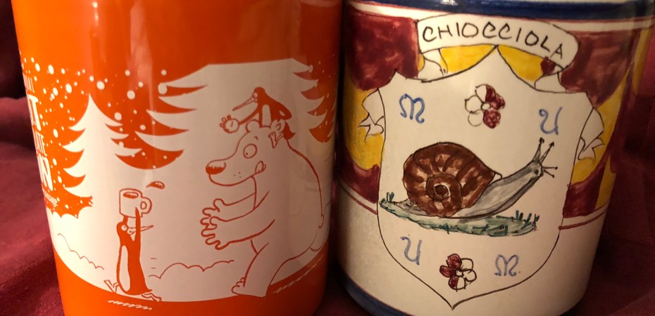 I, as well as everyone else, have always seen me as a complete snail. When Jim and I went to Siena on a side trip during our honeymoon 25 years ago, I naturally identified with the section of town associated with the snail and we bought me a mug to commemorate that. Will running make me have to choose a different patron animal? Here is a photo of my life in mugs: