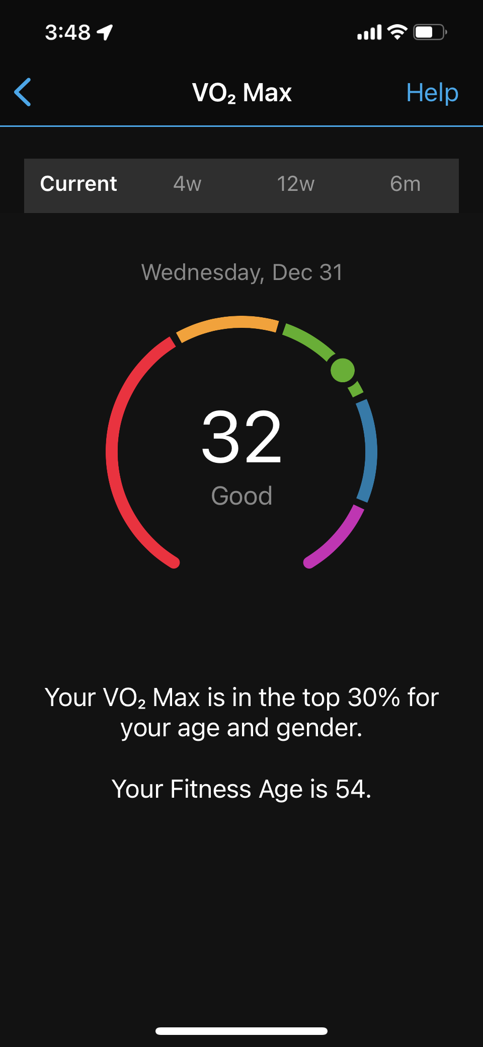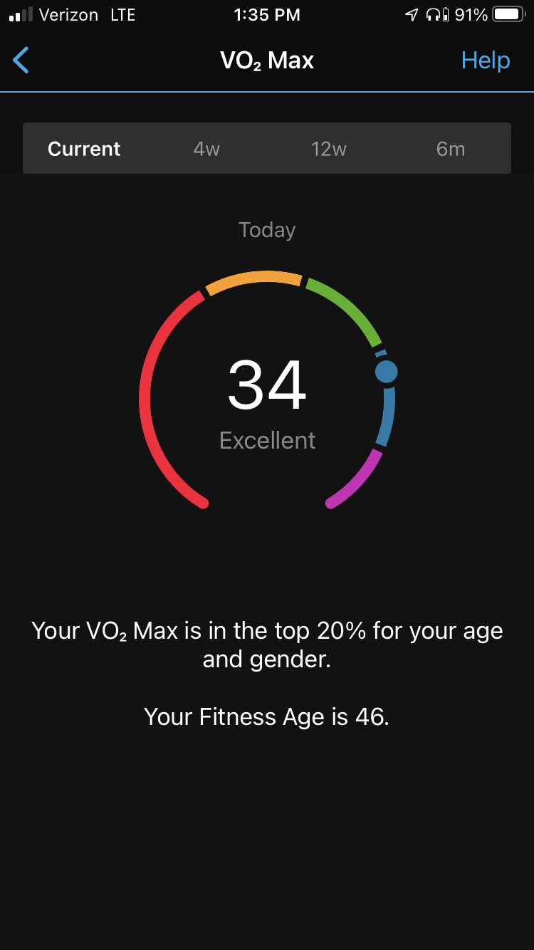 Here is my watch’s reporting of my VO2 max on 9/11/21 and 2/24/22. (Ignore that it says 12/31 on the recent one, not sure why that is happening lately.) Note that my fitness age is lowered considerably with each jump in VO2 max. 33 gets one into the Excellent (blue) category. My goal is to get in the Superior category with VO2 max of 37.8 and up. I wonder how old I’d be if I got into that range??